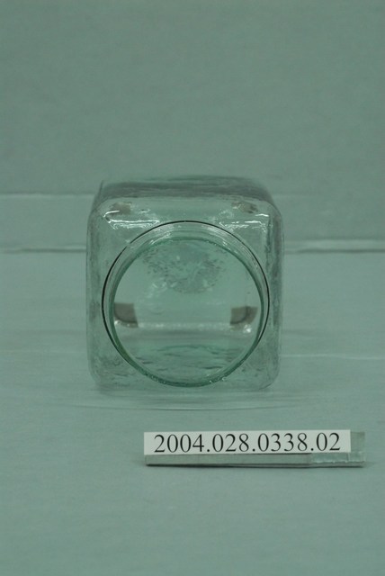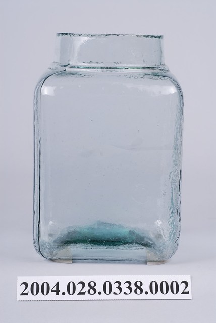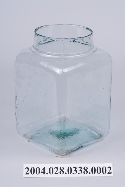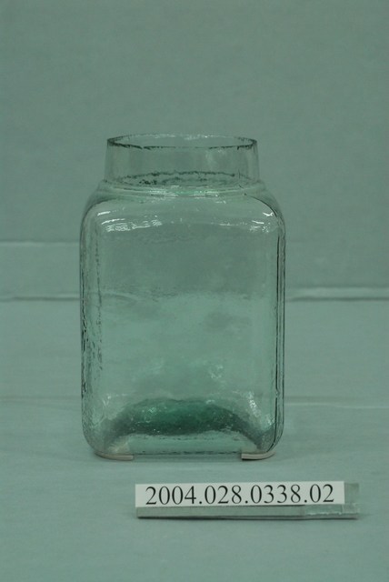 此件透明方形玻璃糖果罐的瓶身由玻璃製成,略透淡藍色,一體成形,瓶口為圓形,短直頸,下接長方形瓶身,肩部與底部的四角皆作圓弧修飾,底部四角另加有墊片,器身素面無特殊紋飾。