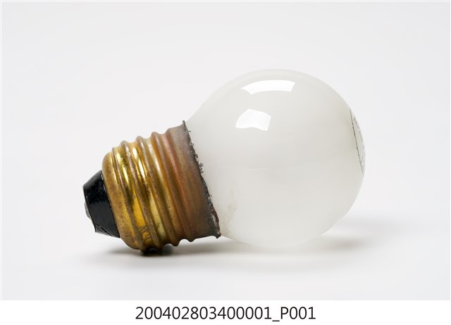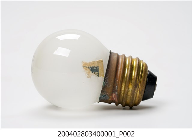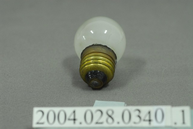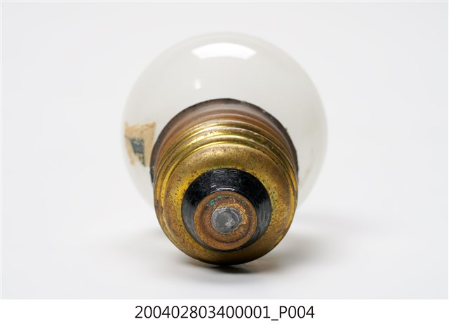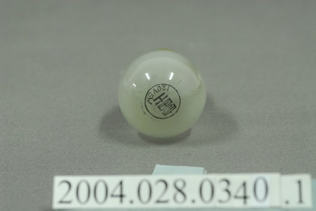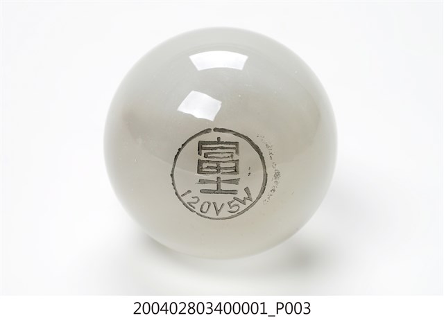1.本件富士牌白熾燈泡為マツダ(MAZDA)電燈組之部件1,燈泡為白熾燈,又稱鎢絲燈。為一種利用電阻將鎢絲加熱至白熾,用來發光的燈。外型呈玻璃製圓球空心狀,內面呈霧白色澤。頂端以黑色印有圓環線框,內帶有富士字樣,以及120V5W的電燈資訊。燈泡座以黃銅製作,表面帶有螺旋槽溝,可與電燈座採旋轉方式固定。2.電燈於日治前半期多為官方、商店、旅館使用,一般民眾大都使用煤油燈。於日治後期,隨著供電與電網的普及,電燈照明用具逐漸走入日常生活中。臺灣的電燈泡生產在日治期的一九二○至三○年代,隨著玻璃工業的民生必需品需求已開始發展,到一九四一年還有專門生產電燈泡的製造廠「新竹電泡製造工廠」,使電燈在臺灣能夠獲得普及。