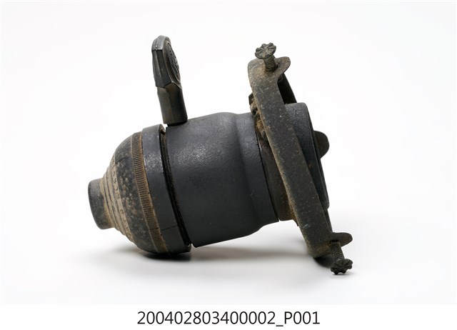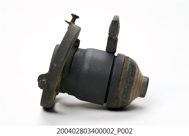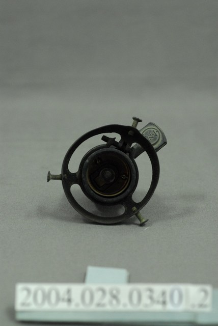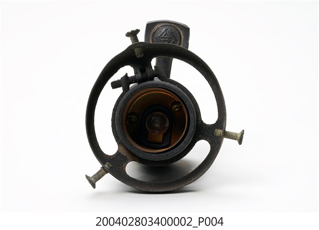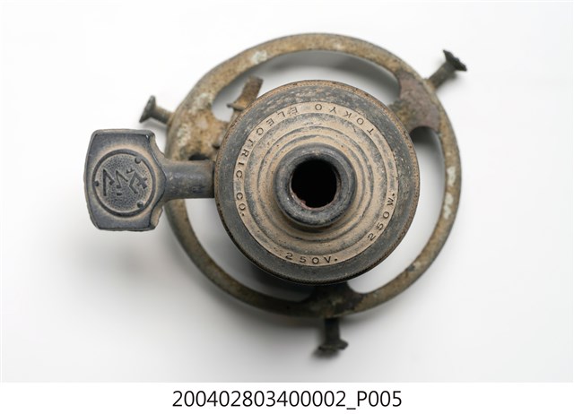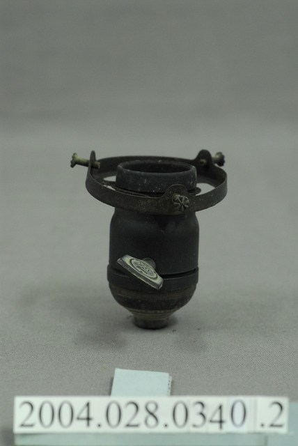 1.本件電燈座為マツダ(MAZDA)電燈組之部件2,電燈座以金屬製作,頂端圓孔用來接合燈泡,外側作圓環形出沿,並附有3顆螺絲可外加燈罩,燈座下方呈圓柱狀,尾端可連接電線,一側帶有長方形板狀旋鈕,旋鈕上壓印有マツダ字樣,為電燈之開關裝置。2.電燈於日治前半期多為官方、商店、旅館使用,一般民眾大都使用煤油燈。於日治後期,隨著供電與電網的普及,電燈照明用具逐漸走入日常生活中。臺灣的電燈泡生產在日治期的一九二○至三○年代,隨著玻璃工業的民生必需品需求已開始發展,到一九四一年還有專門生產電燈泡的製造廠「新竹電泡製造工廠」,使電燈在臺灣能夠獲得普及。