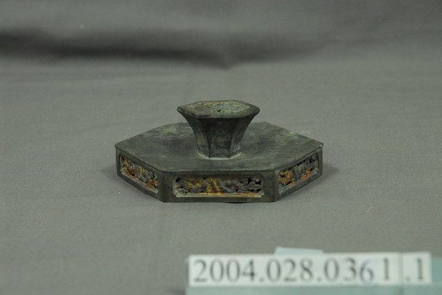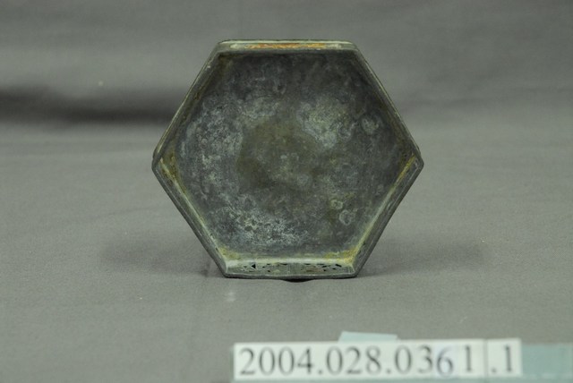 1.六角花窗錫製粉盒盒蓋表面為素面,六個側邊以貼金箔的鏤空花窗裝飾,大部分貼金已脫落,提把為六角柱狀,提把頭以鏤空網格裝飾。2.錫製粉盒是早期婦女家中常見的用品,也時常置於嫁妝用品之列,用來盛裝脂粉或珠寶的收納盒,可防潮又有鍚(惜)福之意。可分為單層、雙層與三層的設計,因裝飾的繁簡不同,而有價位高低的區別,反映出使用者的身份地位之差異,多以八角、六角、圓形的造型呈現,是屬於生活的實用物件。