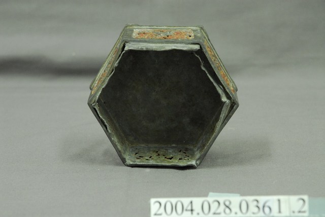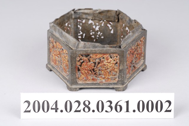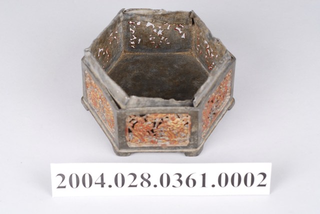 1.六角花窗粉盒身六個側邊以貼金箔的鏤空花窗裝飾,已有部分貼金剝落,盒身上緣與盒蓋開闔處已有部分變形。2.錫製粉盒是早期婦女家中常見的用品,也時常置於嫁妝用品之列,用來盛裝脂粉或珠寶的收納盒,可防潮又有鍚(惜)福之意。可分為單層、雙層與三層的設計,因裝飾的繁簡不同,而有價位高低的區別,反映出使用者的身份地位之差異,多以八角、六角、圓形的造型呈現,是屬於生活的實用物件。