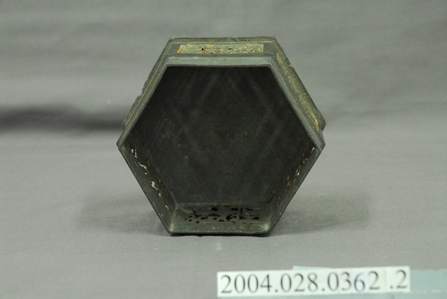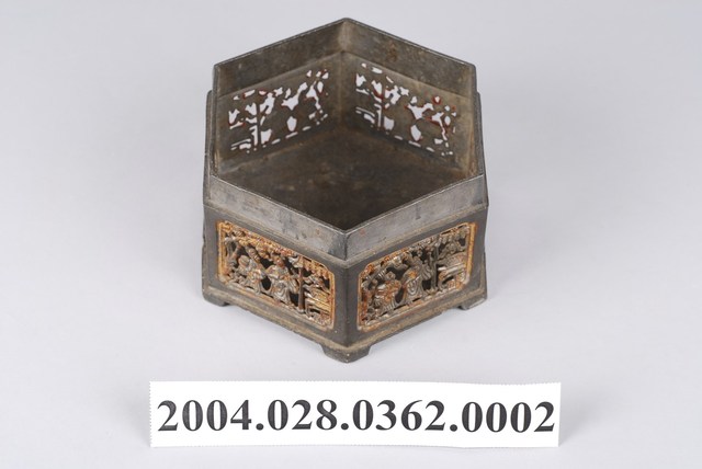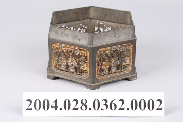 1.六角花窗粉盒身六個側邊以貼金箔的鏤空人物花窗裝飾,人物刻劃十分生動細緻,已有部分貼金剝落。2.錫製粉盒是早期婦女家中常見的用品,也時常置於嫁妝用品之列,用來盛裝脂粉或珠寶的收納盒,可防潮又有鍚(惜)福之意。可分為單層、雙層與三層的設計,因裝飾的繁簡不同,而有價位高低的區別,反映出使用者的身份地位之差異,多以八角、六角、圓形的造型呈現,是屬於生活的實用物件。
