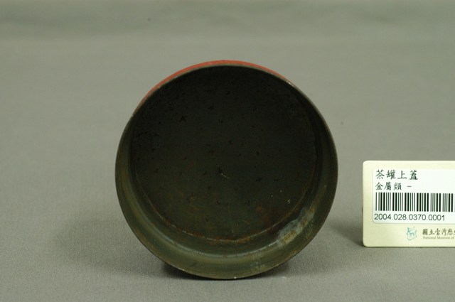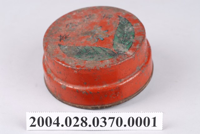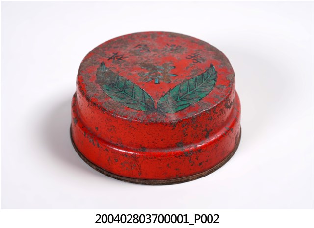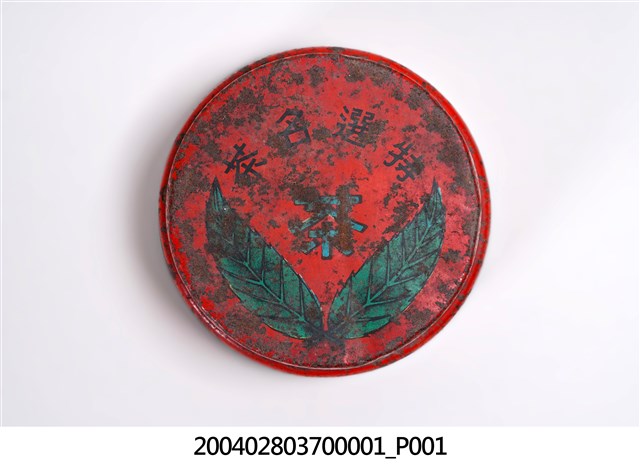 本物件為茶罐上蓋,為圓形,主要由紅色構成,磨損與生鏽的情況略為嚴重,蓋子正面有兩片茶葉裝飾,以及「特選名茶」四字。