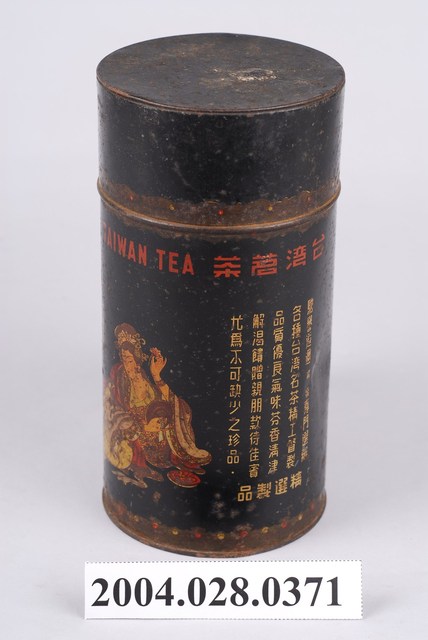 本組物件為茶罐,分為茶罐上蓋與主體兩部分,整體為橢圓柱狀,外觀以黑色為主,上蓋與主體皆有磨損或生鏽,內部並無內容物。茶罐上蓋並無圖案,茶罐上有圖案裝飾與文字。