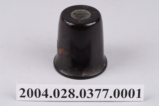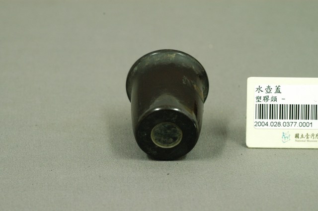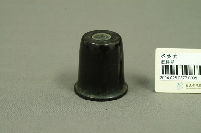 1.本物件為軍用水壺蓋,這個水壺蓋為塑膠製,黑色,型制像圓柱狀,底部較頂部寬大。水壺蓋的頂部有徽章記號,文字為TKD。整個水壺蓋有明顯髒污與傷痕。