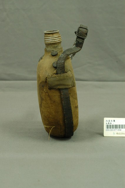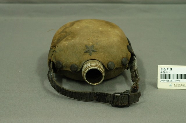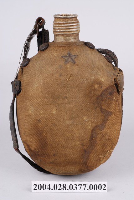 1.本物件為軍用水壺瓶,水壺本體是金屬製,以此當做骨架,並於外層包覆卡其色革皮,最上方有四個鈕扣般的接合處,水壺附有提袋,水壺正面有星星標誌。軍用水壺通常瓶口小,肚子大且扁,便於行軍攜帶。水壺本身有明顯髒汙與生鏽,提把也有使用過度的痕跡。