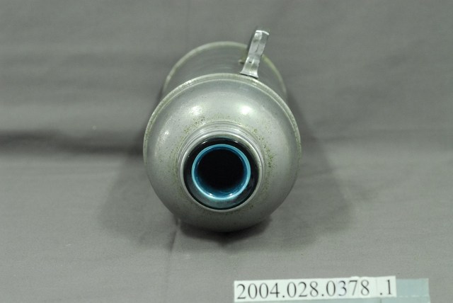 1.本物件是高度約30公分的保溫瓶,配件保存良好,保溫瓶應為不銹鋼製,整體並無太多傷痕,但仍有髒汙現象。該保溫瓶呈現圓柱形,約略四分之一處(有接縫)瓶身開始往上方凸起,整體呈現「凸」字形,瓶身一側有提把便於攜帶。拿掉復健的金屬蓋與橡木蓋後,可以於頂部發現藍熱色膠環。