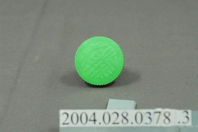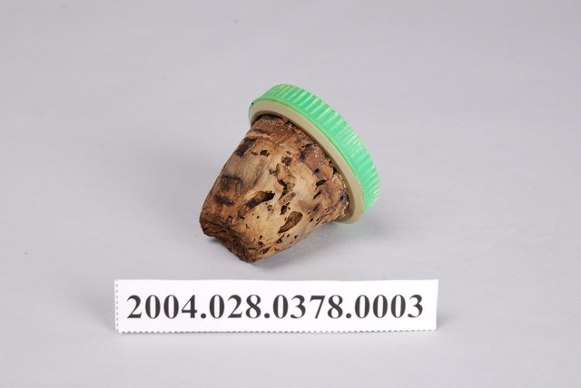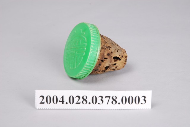 1.本物件是高度約5公分大小的的保溫瓶橡木蓋,其呈現倒三角形,最上面為圓形塑膠,為綠色、類似酒蓋的造型,側邊皆有凹痕便於拿取,最上方瓶面寫著「益新」二字。本文物個圓形塑膠之下,即為橡木塞,疑因使用許久,橡木塞有許多凹洞,並不完整。本物件為一個橡木蓋是用以隔絕熱傳導而產生的。
