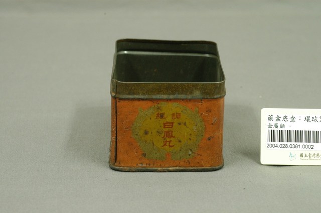 本文物為環球製藥廠調經白鳳丸之盒身,側面寫著「環球調經白鳳丸、服法功用詳載說明書、專治婦女失血月經、環球製藥廠出品」。藥盒表面有多處的生鏽、污漬以及刮痕。白鳳丸為女性調經藥品,成分包含︰熟地黃、貝母、黃耆、黃連、茯苓、地骨皮、當歸、乾薑、芍藥、延胡索、牡丹皮、秦芄、香附、艾葉、生地黃、青蒿、牛膝、柴胡、知母、白毛烏骨雞。目前臺灣的中藥沒有此配方,為中國大陸婦女使用的保健藥品。