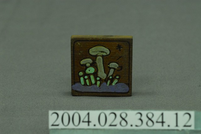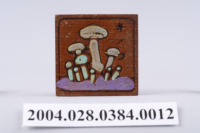 本文物為木板淺刻,正面刻有片假名キ字(音ki),背面為單面彩繪,圖面有片假名キノコ字樣(蕈,音kinoko)及數根白色、藍色蕈菇,下方為淺紫色地面。