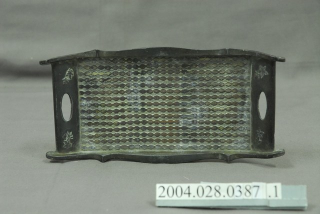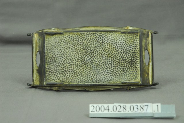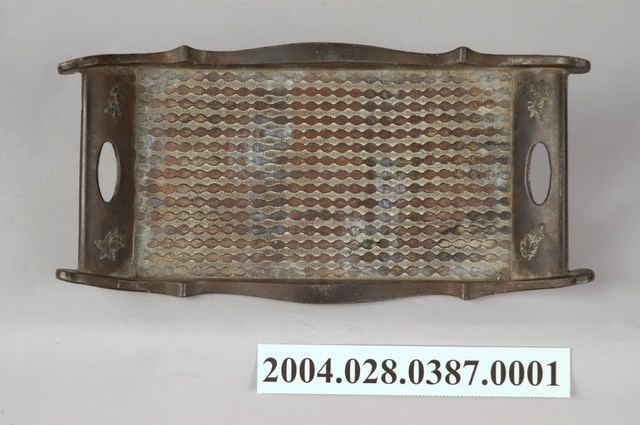 本物件為菸灰缸盤,為金屬材質,長方形樣式,盤內表面有連續橢圓花紋,長邊有圓弧突起邊框,短邊各有握把,上有一橢圓圓孔及樹葉刻紋,底部有如橘皮的花紋,物件有鐵鏽。