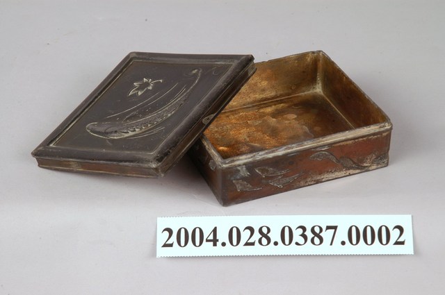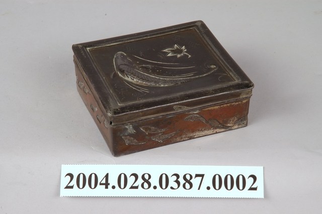 本物件為煙盒,為金屬材質,正方形樣式盒子、包含盒蓋及盒身各一,盒蓋上有一鯉魚及楓葉花紋、盒身側面四面皆有鯉魚雕刻花紋,物件有鐵鏽。