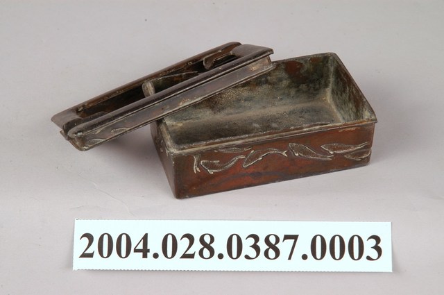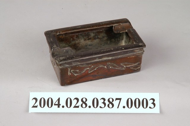 本物件為菸灰缸,為金屬材質,長方形樣式盒子、包含盒蓋及盒身各一,盒蓋為中空,短邊處各有一凹槽可放置香菸、盒身側面四面皆有鯉魚雕刻花紋,物件有鐵鏽。