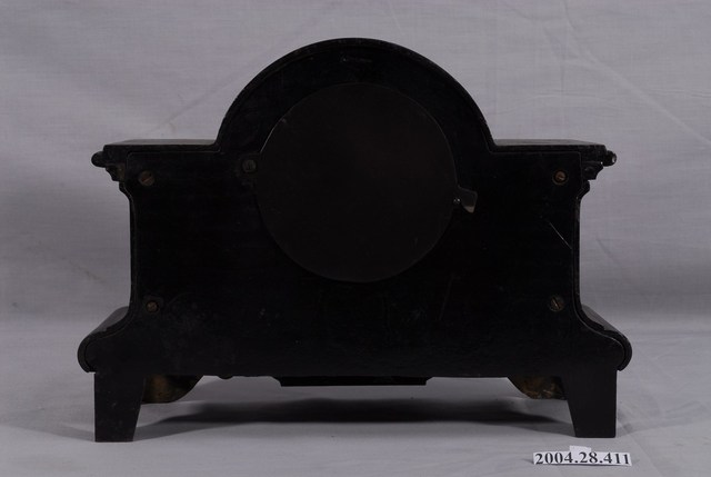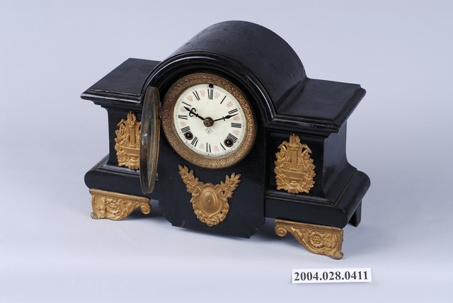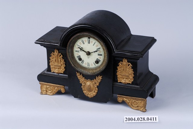 1.本件美國安索尼亞鐘錶公司製木質座鐘,主要放置於櫃體或桌面之上,除了顯示時間之外,也具有擺飾的功能。座鐘以木材製作盒體,頂蓋外形為中央作半圓拱形突起,左右平直延伸,如Ω字形。下接扁狀長方體,底有四足,全體塗佈深色木漆。座鐘正面中間有圓形文字版外加透明圓形玻璃罩,文字板以羅馬數字1至12顯示時間,圓心正下方印有「A」字商標圖,4及8數字上各有圓形插孔,用來上鍊時間發條與鐘響發條。文字版外有浮雕紋銅環裝飾。另鐘面的左、右、下三方個別貼有上金漆的木雕紋章,正面的兩個底足也有金色浮雕三角木片做為裝飾。製作精美的