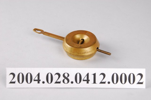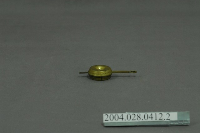 獅頭座鐘鐘擺,黃銅製,依結構可分為擺桿及擺錘兩部分。擺桿上半部呈長方柱狀,至頂端略為寬扁,中央留有孔洞以便掛置於機芯之下;擺桿下半部為表面帶有螺紋的圓柱狀,桿上旋有一螺帽。擺錘部分由兩片立體圓形銅片對夾擺桿而成,上下兩端切口供桿身通過,中央凹陷開孔使螺帽露出。銅片正面左右印有「S」及「F」英文字樣,分別代表慢(Slow)及快(Fast)之意,按照指示方向左右轉動調節螺帽,可以調整鐘擺長度,進而改變鐘擺擺動的速度。