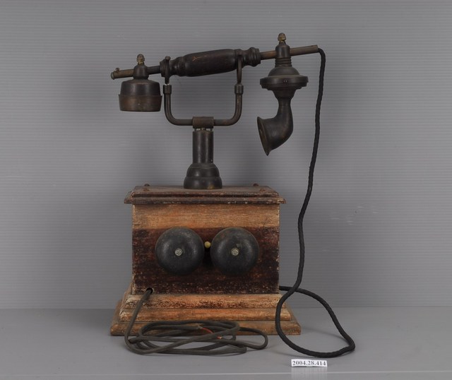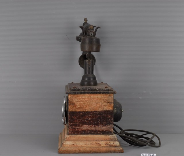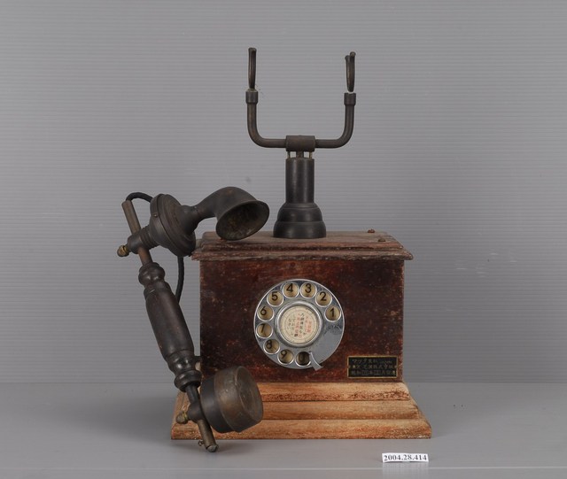 1.本圖之電話機,為桌上型撥號盤式電話機,本機種設計與用料(木頭)都較為古典。撥號式電話機大概在1917年就已經商用化,其原理為使用撥號盤撥1到0的號碼時,即送出代表該號碼的一串斷續脈衝(Pulse)信號,透過機房的自動交換機接到對方的號碼。