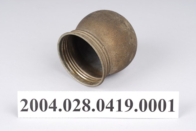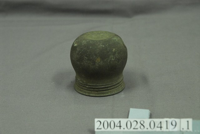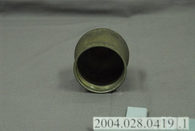 1.本物件為鐵製保溫瓶蓋,外表為圓體,類似水母型製,下方與瓶身接縫處沿著圓柱有3個圓弧,應是使人便於拿取而設計,瓶蓋本身除髒污與鏽痕外,也有一些凹痕。