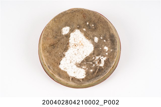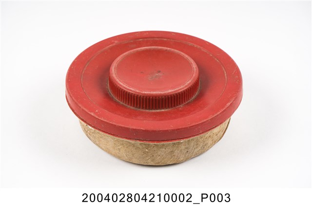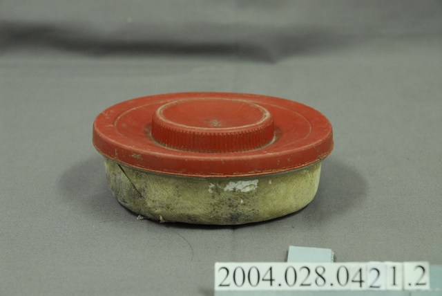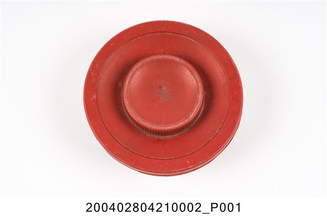 本件冰桶內蓋為鋁製彩繪水果紋冰桶部件之二,以橡膠和保麗龍製成,外觀呈扁圓形,分為上、下兩層,上層為紅色橡膠製成的蓋頂,頂部作一圓形下凹造型,中央扁圓形蓋扭側邊以細密直紋裝飾,下層為保麗龍製成的塞子,表面包一層紗布,上面留有使用過的汙漬痕,紗布以磨損破洞,可清晰看見裡面白色的保麗龍。保麗龍塞的直徑略小於冰桶口,塞入時利用保麗龍具彈性的特性增加密封性,防止內部液體滲出,保麗龍亦具有保溫效果。