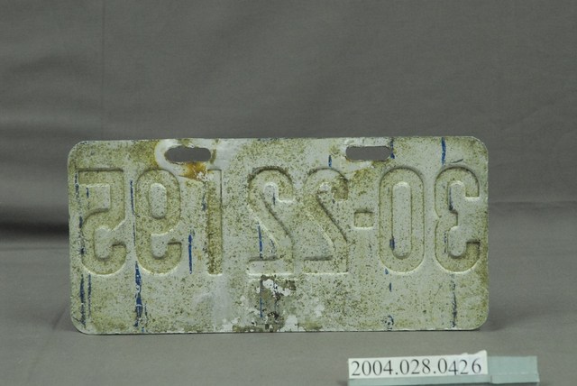 1.本物件為西元1978至1983年間發出的輕型機車車牌。車牌為長方形,底色為藍色,字色為白色。車牌中央書寫「30-22195」車號;車牌上方偏左、偏右處各穿1個扁橢圓形孔,以便於懸掛。