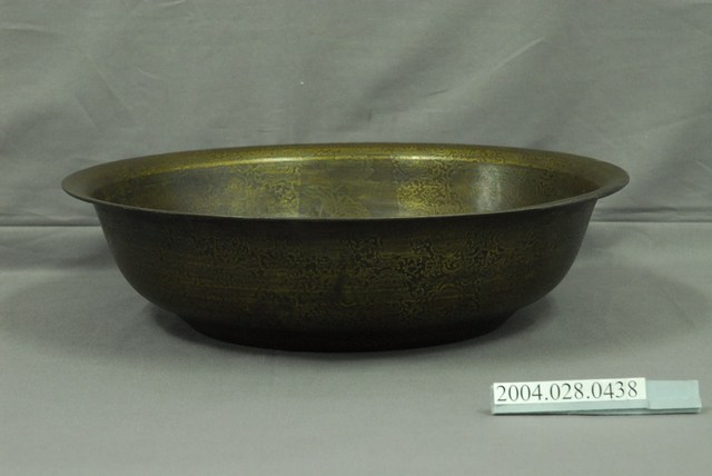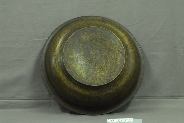 1.本件銅製牡丹花草暗紋臉盆,通身以銅金屬製作而成,呈長37.2公分,寬37.2公分,高9.5公分,外型呈上寬逐漸下窄之圓形深盆狀,口部外撇。器身下半段接近底緣處帶有一道轉折並收束成盆底,底部呈平底。其器表帶有繁複的蔓花草卷紋,外側盆底中央壓印有「光緒年製」。器身內側底部裝飾有牡丹花紋,側邊則帶有蓮花花紋。2.臉盆主要做為衛生盥洗,裝盛清水用於清洗臉部與手部。其材質多見於木製、銅製、搪瓷等,傳統來說一般民眾多以木盆為主,銅製則較為昂貴。通常精美的銅製臉盆均會以裝飾精美華麗繁複的臉盆架作搭配。