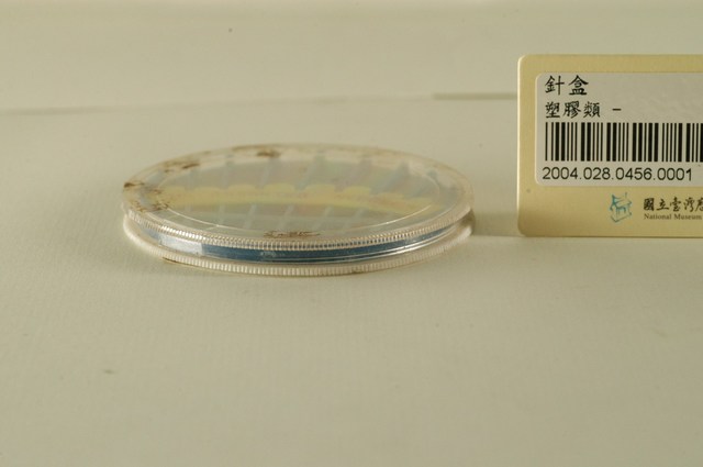 1.本物件為塑膠製的圓形儲針容器,外層是透明可旋轉圓蓋,內層是藍色的8格儲針格,中央自左向右有字樣「30」、「ASSORTED」、「NEEDLES」,可藉由轉動圓蓋,選擇取出哪一格的縫針使用。