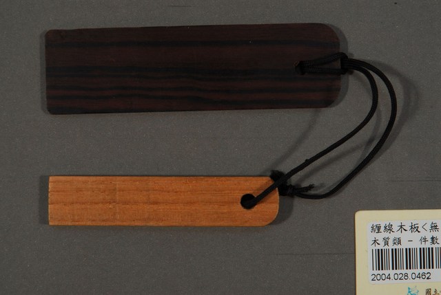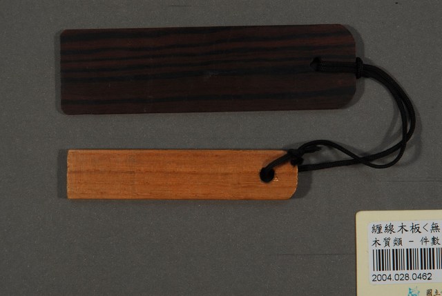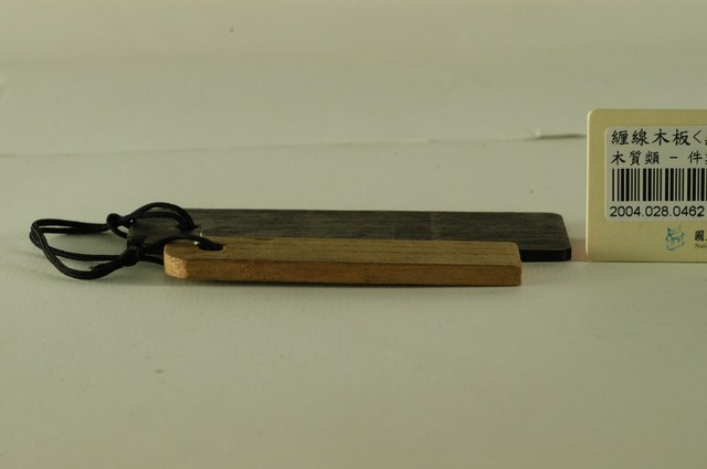 1.本物件為2件式1大1小的纏線木板,外觀長條棒形無彩繪圖樣,大纏線木板為深咖啡色、小纏線木板為淺棕色,2個皆鑿有孔洞並以黑繩串接相連。