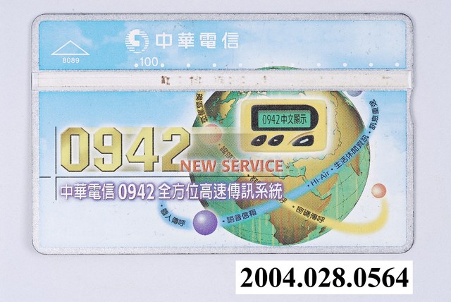 1.本物件為印有「0942全方位高速傳訊系統」標語的電話卡,是1998年10月發行常用卡,發行量200萬張。正面以彩色印刷,背景為「0942 NEW SERVICE 中華電信0942全方位高速傳訊系統」字樣及地球、四周圍繞著一些服務項目標語的插圖,左上方有三角形插入方向符號,編號為8089,正中間上方印有中華電信的字樣及標誌,下方有一條銀色帶狀的設計,上方有顯示100的面額,卡片四周也以銀色為邊框。