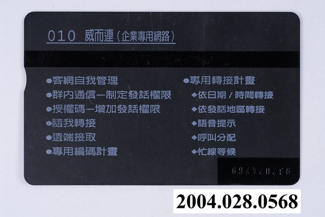 1.本物件為印有「010威而連(企業專用網路)」標語的電話卡,1999年發行,發行量200萬張。正面以彩色印刷,背景為「010威而連(企業專用網路) 客網自我管理 群內通信 遠端接取 專用編碼計畫 專用轉接計畫」字樣及3個人、中華電信標誌的插圖,左上方有三角形插入方向符號,編號為9009,正中間上方印有中華電信的字樣及標誌,下方有一條銀色帶狀的設計,上方有顯示100的面額,卡片四周也以銀色為邊框;背面印有各個服務項目,分別為「客網自我管理 群內通信制定發話權限 授權碼增加發話權限 隨我轉接 遠端接取 專用編碼計畫 專用轉接計畫 依日期/時間轉接 依發話地區轉接 語音提示 呼叫分配 忙線等候」。
