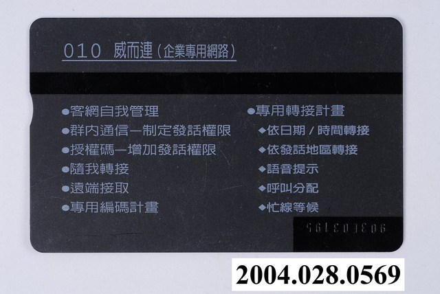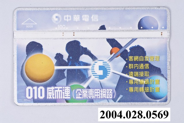 1.本物件為印有「010威而連(企業專用網路)」標語的電話卡,1999年發行,發行量200萬張。正面以彩色印刷,背景為「010威而連(企業專用網路) 客網自我管理 群內通信 遠端接取 專用編碼計畫 專用轉接計畫」字樣及3個人、中華電信標誌的插圖,左上方有三角形插入方向符號,編號為9009,正中間上方印有中華電信的字樣及標誌,下方有一條銀色帶狀的設計,上方有顯示100的面額,卡片四周也以銀色為邊框;背面印有各個服務項目,分別為「客網自我管理 群內通信制定發話權限 授權碼增加發話權限 隨我轉接 遠端接取 專用編碼計畫 專用轉接計畫 依日期/時間轉接 依發話地區轉接 語音提示 呼叫分配 忙線等候」。