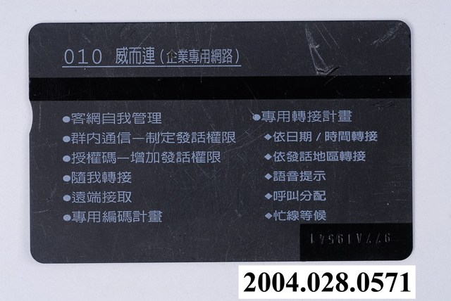 1.本物件為印有「010威而連(企業專用網路)」標語的電話卡,1999年發行,發行量200萬張。正面以彩色印刷,背景為「010威而連(企業專用網路) 客網自我管理 群內通信 遠端接取 專用編碼計畫 專用轉接計畫」字樣及3個人、中華電信標誌的插圖,左上方有三角形插入方向符號,編號為9009,正中間上方印有中華電信的字樣及標誌,下方有一條銀色帶狀的設計,上方有顯示100的面額,卡片四周也以銀色為邊框;背面印有各個服務項目,分別為「客網自我管理 群內通信制定發話權限 授權碼增加發話權限 隨我轉接 遠端接取 專用編碼計畫 專用轉接計畫 依日期/時間轉接 依發話地區轉接 語音提示 呼叫分配 忙線等候」。
