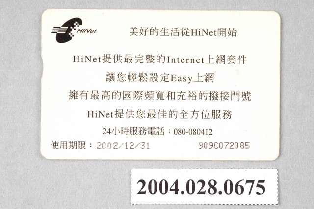 1.本物件為印有嘉德麗亞蘭(二)字樣的IC卡,為2001年以後發行卡,發行量50萬張。正面以彩色印刷,背景為嘉德麗亞蘭的圖像及印有「嘉德麗亞蘭(二)」的字樣,左方印有箭頭插入方向符號及晶片,下方印有中華電信的字樣、標誌及面額200;卡片背面印有「美好的生活從HiNet開始 HiNet提供最完整的Internet上網套件 讓您輕鬆設定Easy上網 擁有最高的國際頻寬和充裕的撥接門號 HiNet提供您最佳的全方位服務 24小時服務電話:080-080412 使用期限:2002/12/31 909C072085」的字樣。