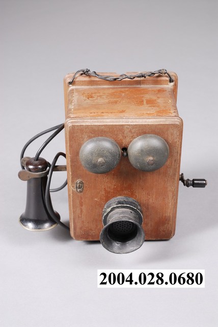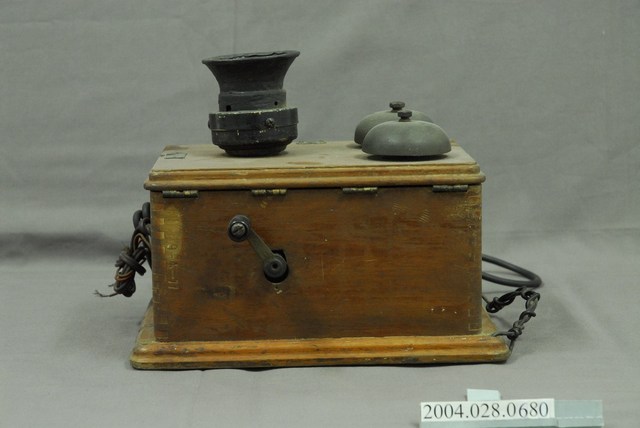 1.本物件為牆掛式木殼磁石電話機,可說是最早期的電話機。方形體底座,正面有聲筒和兩個響鈴;右側為話筒及其支架,左側為轉動把手;下方為塑膠線和金屬線。正面下方有一東京日本電器株式會社的金屬牌;正面右下角刻有N-80字樣。