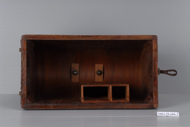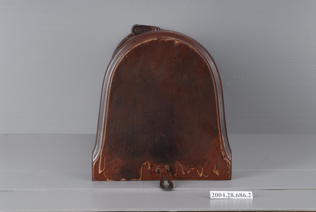 1.本物件是勝家手搖式縫紉機的木製罩式外盒,頂部為圓弧狀。盒子正面有葡萄藤飾的金色花紋,花紋內文字無法辨識。盒頂安裝有螺紋提把,盒子裡部有一長方形一正方形空格,盒子底部外緣有一個扣鎖可與縫紉機鎖定。