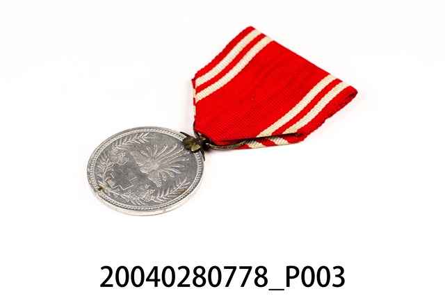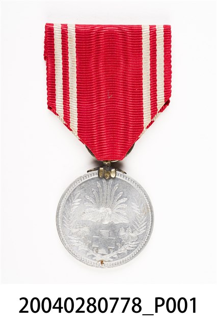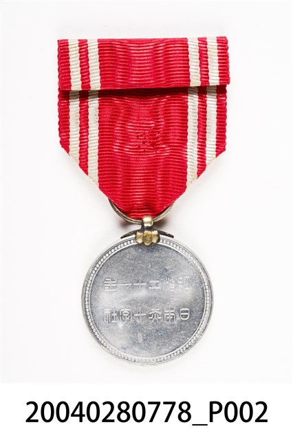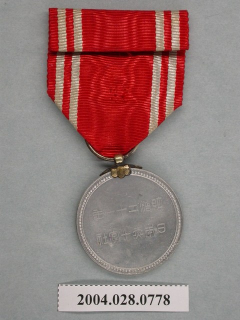 1.本物件為日本紅十字社徽章,徽章吊於一紅白相間布料之上,徽章本身為銀色,正面有十字標幟,背面浮刻出年份為明治21年。