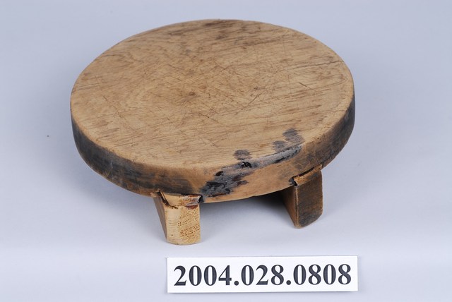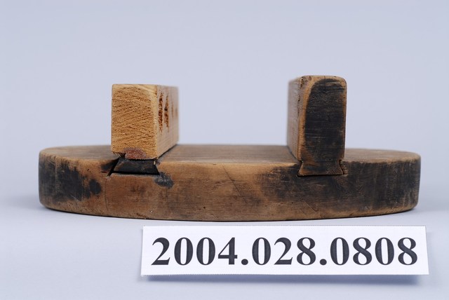 圓形木蓋,由三塊木塊拼製而成,直徑約21公分,底部為一圓形木塊,具有厚度,上方以卡榫方式嵌入兩個長條形木塊作為把手方便拿取,長條木塊前後兩端斜切以符合圓木蓋邊緣的弧度。外觀為原木色,外表面上有乾漆或透明漆,此種木蓋蓋一般用來蓋在鍋子或飯桶身上方,用來保溫和防止落塵或其他異物掉進鍋裡或桶內,木蓋側邊帶有黑色痕跡,可能為煮飯加熱造成的焦痕。另外,蓋底平面可見許多類似刀痕的直條細紋,推測此木蓋可能也被翻過來當做鉆板使用。