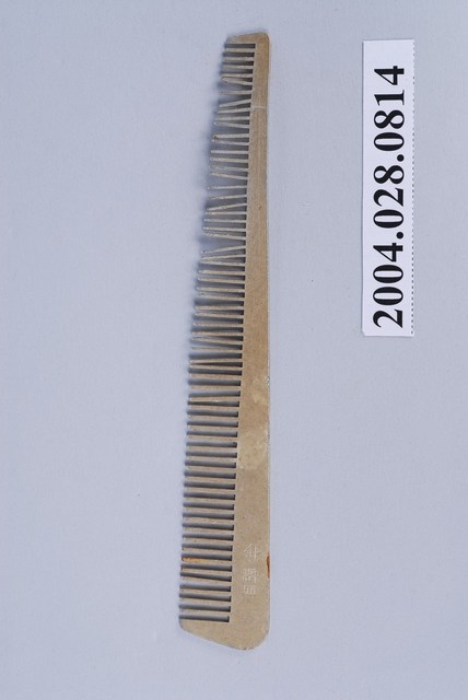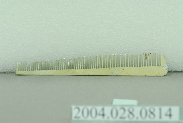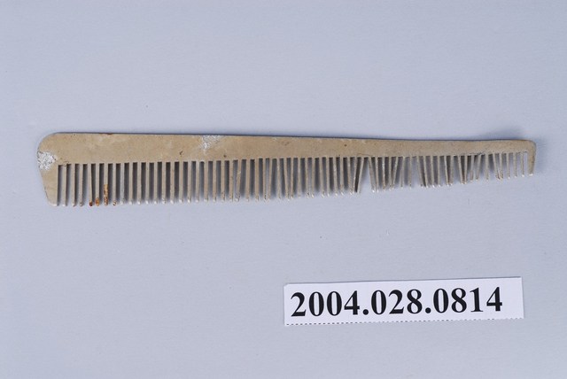 本件自強牌鐵製扁梳以鐵片一體成形製作,於表面塗布白色漆料,其櫛齒與梳背邊緣略帶有紅褐色鏽痕,呈長15.2公分,寬2.2公分,高0.4公分。外形呈現橫式長方形片狀,於一端較寬面逐漸往另外一端窄縮。扁梳上方梳背平直,於寬面一側打印有陰刻「自強」字樣,右側帶有標誌。下方作等距緊密切割成櫛齒狀,末端略為斜削呈尖錐狀,其櫛齒於寬面端往窄面端逐漸縮短,櫛齒因碰撞略有歪斜現象。本件扁梳為日常梳理頭髮使用,也可用於理髮時與剪刀或推剪搭配使用。