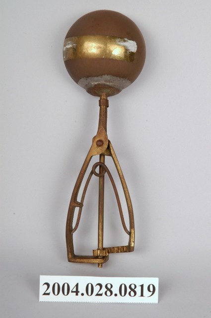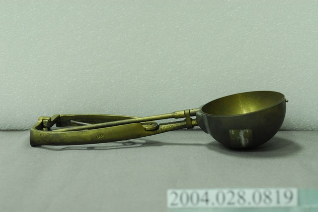 1.尺寸編號22的銅製挖冰器,較一般尺寸略大。杓面呈半圓形凹碗狀,握把為三角形;杓面與握把間有明顯錫焊接痕跡,握把底部有連接刮條棒的齒輪連動結構,頂部以圈環箍住刮條棒;刮條呈半圓弧狀,可在杓面內部來回滑動以刮除挖入的冰球;握把內側各有固定彈簧的凹槽與凸欄,用以固定倒V字型的彈簧。此件舀冰杓握把底部外側刻有「彰化吉」字樣,為彰化專門製作冰杓的老工匠黃有信的作品落款,因年事已高,現已退休,現由其子黃國樑繼承該項手工技藝。2.此種舀冰杓為臺灣早年販賣桶裝冰品(俗稱芋仔冰或叭噗)的必要工具。使用時以杓面將冰品挖成球狀後,再將把手向內側擠壓,即可將冰球刮除脫離。此類銅製舀冰杓皆為手工打製而成,後多為不鏽鋼機器製,但刮除效果不如銅質好。現今仍有少數販賣傳統冰品店家持續使用銅製冰杓的現象。