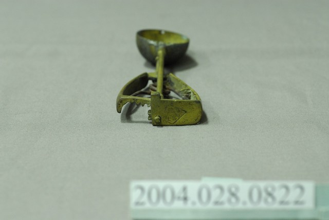 1.尺寸編號13的銅製挖冰器,屬常見的尺寸。杓面呈半圓形凹碗狀,握把為三角形;杓面與握把間有明顯錫焊接痕跡,握把底部有連接刮條棒的齒輪連動結構,頂部以圈環箍住刮條棒;刮條呈半圓弧狀,可在杓面內部來回滑動以刮除挖入的冰球;握把內側各有固定彈簧的凹槽與凸欄,用以固定倒V字型的彈簧。因年代久遠,握把與杓面處有些許銅鏽痕跡,握把間的鐵製彈簧有生鏽情況。此件舀冰杓握把底部外側刻有菱形框邊的「彰化富士」字樣與富士山圖像,屬於該冰杓製作者的落款,現已停產。2.此種舀冰杓為臺灣早年販賣桶裝冰品(俗稱芋仔冰或叭噗)的必要工具。使用時以杓面將冰品挖成球狀後,再將把手向內側擠壓,即可將冰球刮除脫離。此類銅製舀冰杓皆為手工打製而成,後多為不鏽鋼機器製,但刮除效果不如銅質好。現今仍有少數販賣傳統冰品店家持續使用銅製冰杓的現象。