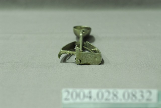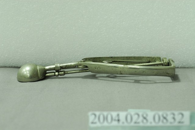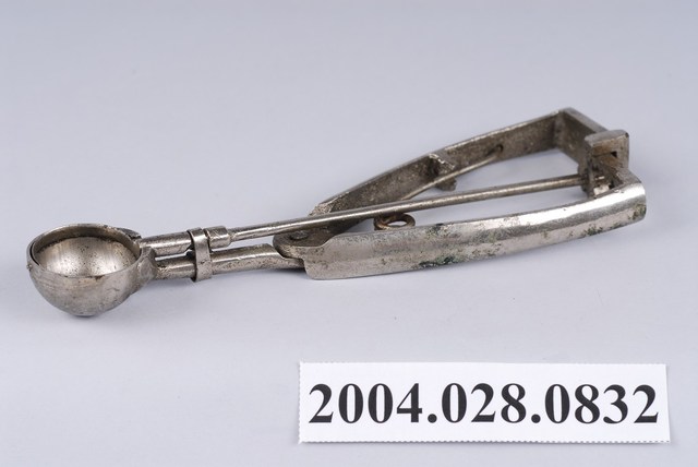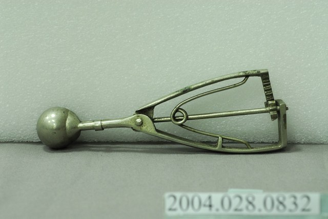 1.尺寸編號09的挖冰器,較一般尺寸略小。杓面呈半圓形凹碗狀,握把為三角形;杓面與握把間有明顯焊接痕跡,握把底部有連接刮條棒的齒輪連動結構,頂部以圈環箍住刮條棒;刮條呈半圓弧狀,可在杓面內部來回滑動以刮除挖入的冰球;握把內側各有固定彈簧的凹槽與凸欄,用以固定倒V字型的彈簧。因保存狀況不佳,有些許氧化變黑與綠鐵鏽斑駁感,握把間的鐵製彈簧有生鏽情況。此件舀冰杓握把底部外側刻有橢圓形虛線框邊的「彰化恊和」字樣,屬於該冰杓製作者的落款,現已停產。2. 此種舀冰杓為臺灣常見用來舀挖桶裝冰品的用具,店家或自家使用皆可見。使用時以杓面將冰品挖成球狀後,再將把手向內側擠壓,即可將冰球刮除脫離。