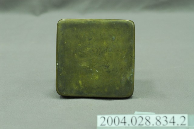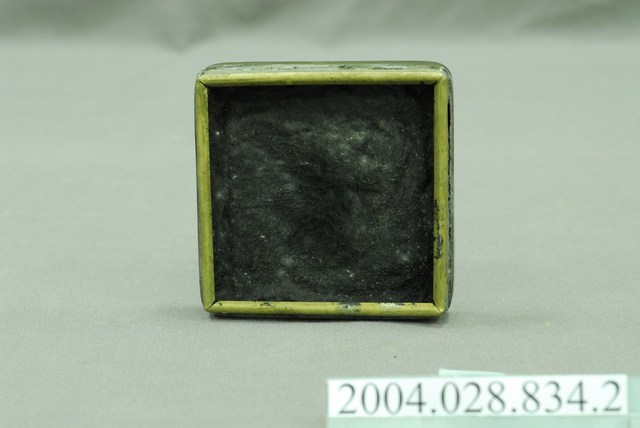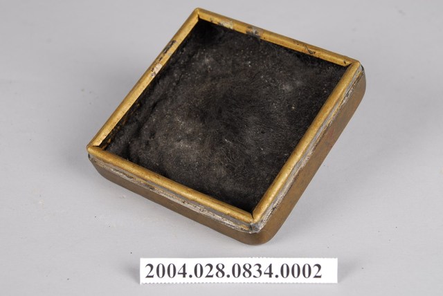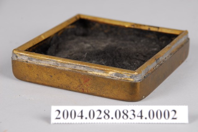 本文物為銅盒墨膏。銅製,呈現出盒子上蓋的樣貌。裡面原有墨膏,銅製,銅色,正方形偏長方形的形體。盒蓋上面刻有「莊敬自強」、「達華製」字樣,蓋子的右上方有銅綠產生。