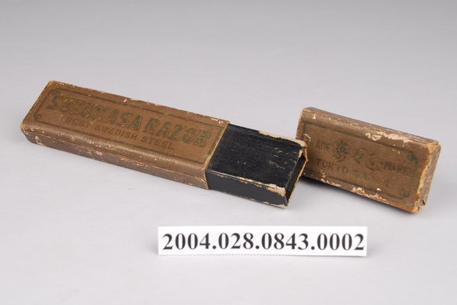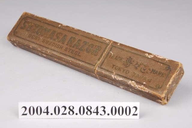 本件包裝外盒為SUZUMASA牌象牙柄直式剃刀之部件2,又可分為盒蓋與盒身2部件,主要功能為收納直式剃刀,呈長17.2公分,寬3.4公分,高1.6公分之長方形扁盒狀。盒身口緣內縮,盒蓋與盒身作套合式開闔設計,表面均以淺咖啡色仿皮革壓紋厚紙張包覆,表面以陰刻深咖啡色壓紋作英文字樣與商標。包裝外盒因年代久遠,邊緣部分略有磨損而露出紙質內裏。