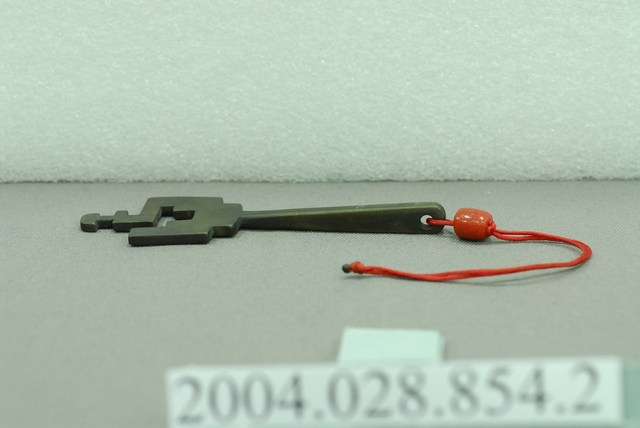 1.本件鑰匙為銅製蓮竹紋廣鎖組之部件2,以黃銅材質製作而成。外型呈現圓頭錐形握柄,前端成板片平面狀,作多重幾何形。其尾端帶有圓孔,穿有帶著紅色彩石之紅繩。鎖體利用造形複雜的鑰匙舌片,藉著不同方向與角度逐漸插入鎖孔,最後透過舌片對於簧片的擠壓,釋放固定鎖頭的構件完成開鎖。其需要利用鑰匙以特殊方向與特殊角度才可開啟之鎖體,稱為定向鎖類型。2.中國傳統鎖具可分為簧片掛鎖與組合鎖兩大類。簧片掛鎖是古中國最常使用的鎖具,其利用簡單的彈簧彈力及巧妙的幾何尺寸安排,配合鑰匙的設計,產生開鎖與閉鎖的功能。鑰匙則可依其數目來分類;使用一把鑰匙來開鎖者,稱為簡單鑰匙,使用二把以上鑰匙來開鎖者,稱為複合鑰匙。