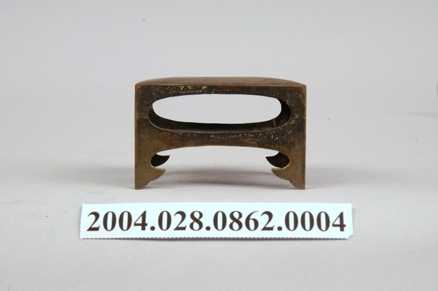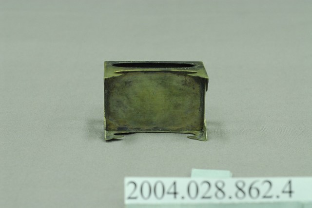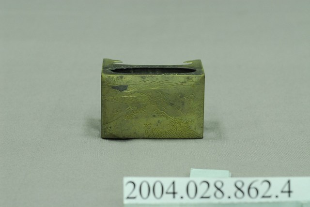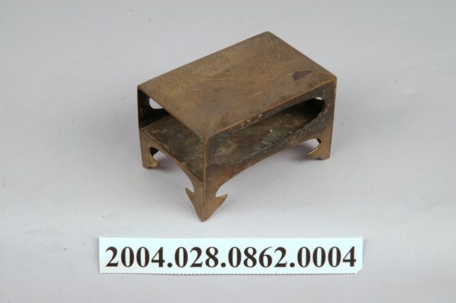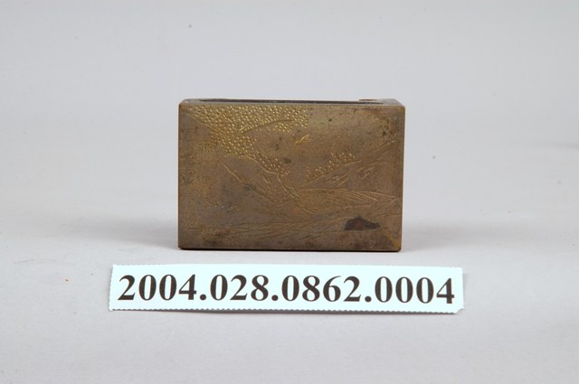 本物件為菸灰缸,為金屬材質,長方形樣式,表面刻有山水畫圖案,中間有夾層,底部有四個箭頭形狀的腳,整體與桌子相似,有鐵鏽、污漬。