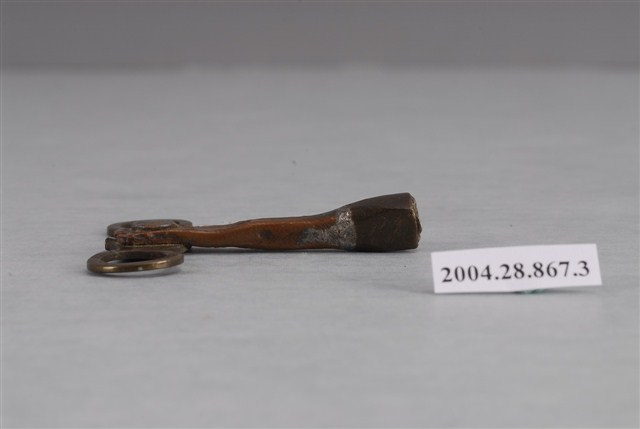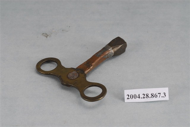 八仙木座鐘發條鑰匙,金屬製,尺寸為長4.9公分,寬5.1公分,厚0.9公分,依結構可分為轉柄及套筒兩部分。轉柄外觀呈左右對稱穿有圓孔的8字型,中央處焊接下方I字型套筒。套筒頂部與轉柄連接處略為扁平,向下漸漸開闊,底部製成中空柱狀,用來插入座鐘文字板上的發條孔洞,藉由旋轉發條手動上鍊,給予座鐘走時及報時的動力。
