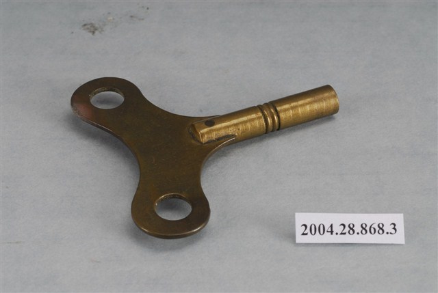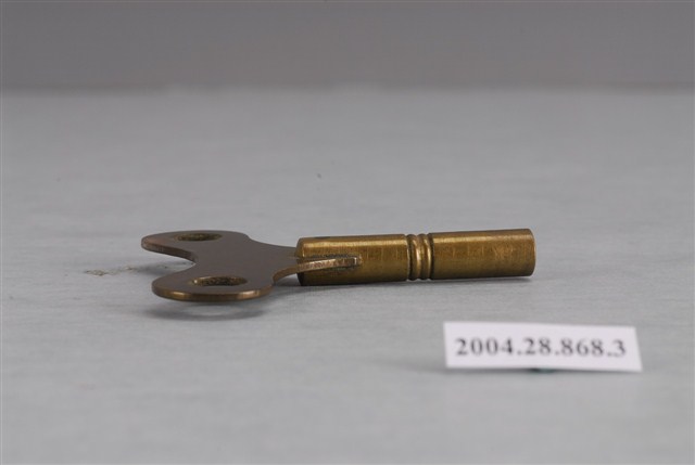 本件發條鑰匙為日本高野時計製作所製木質掛鐘組的部件之3,通身以黃銅製作而成,整體外觀呈現Y字形,可分為轉柄與套筒身。轉柄呈扁平片狀,左右側帶有圓形透孔,中央下方切割一道卡榫。套筒身呈圓柱狀,頂端同樣切割有一道卡榫與轉柄接合固定,筒身帶有3條環型線條,底端為中空筒狀,用來插入掛鐘的發條孔洞,旋轉以上緊發條。