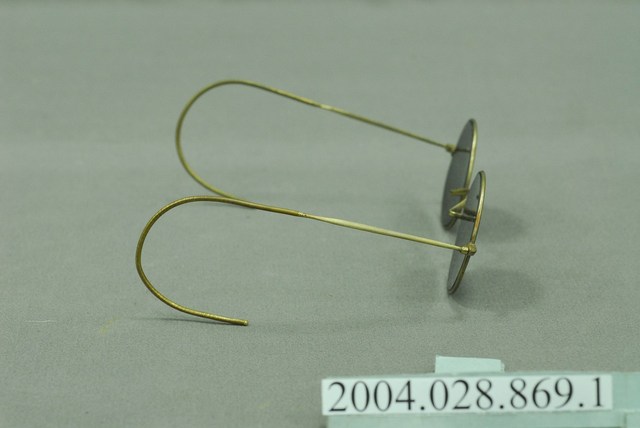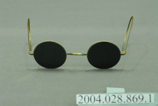 本件為古董太陽眼鏡,圓形金色金屬框,鏡片為全黑色,鏡框、鏡架略有生鏽。眼鏡自清代即有使用紀錄,原本為奢侈品,且流行於文人間,還有裝飾精美的眼鏡袋。隨著年代變遷,眼鏡逐漸成為尋常之物。