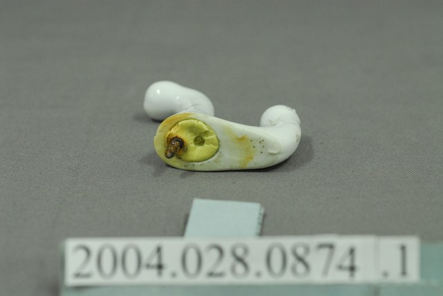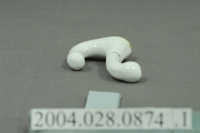 1.本件白瓷掛鉤為白瓷掛鉤組組件之1,呈長7.4公分,寬6.2公分,高1.9公分,通身以白色瓷土壓模塑形後,表面施以釉料燒製完成。外型呈一長一短向上彎曲之圓柱形掛鉤狀,頂端呈圓球形,器身帶有明顯的分模線痕跡,底面為平直的壁掛面,上端帶有圓形凹槽,內部以黃色樹脂填充,並固定有鐵製螺絲釘。2.本件白瓷掛鉤主要作壁掛使用,壁掛面固定有鐵製螺絲,以旋轉方式旋入壁面後即可固定使用。傳統掛勾多以樹木分岔枝椏經簡單加工後即可使用,以瓷製作之壁掛勾除了實用功能之外,也兼具美化裝飾的效果。掛鉤主要吊掛衣物使用,其餘小型物