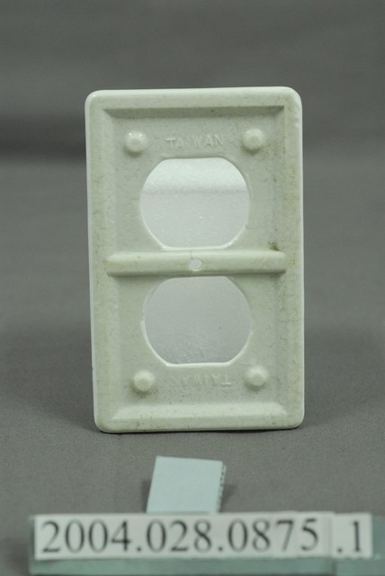 1.本件瓷製插座蓋板為青花瓷製插座開關蓋板組部件之1,通身以瓷土壓模製作,正面施以白色釉料後,採貼花裝飾工法,貼印帶有鈷藍釉料的圖案後燒製而成,背面則採素燒方式露出略帶灰白的坯體,並壓印有TAIWAN英文字樣。其外觀呈長方形平面板狀,蓋板斜對角兩側裝飾有菊花等花卉枝葉圖案做裝飾。蓋板中央處帶有兩個橢圓形透孔,為嵌合插座之用,兩孔之間帶有圓形透孔,可使用螺絲將電線盒與蓋板固定。2..本件插座蓋板為建築使用的插座飾板,除了可固定插座孔以外,也兼具裝飾環境細節的作用。其蓋板為大量製作的工業產品,細緻的貼花圖案