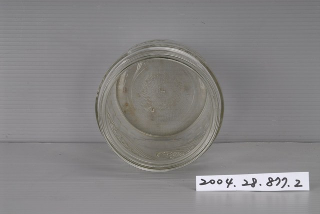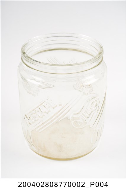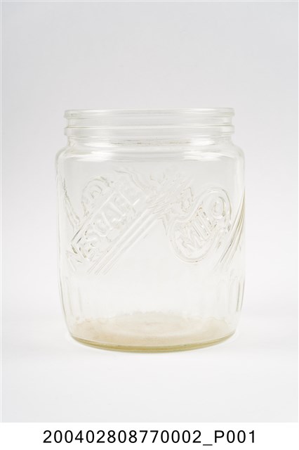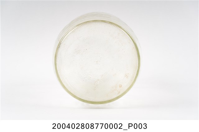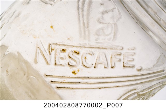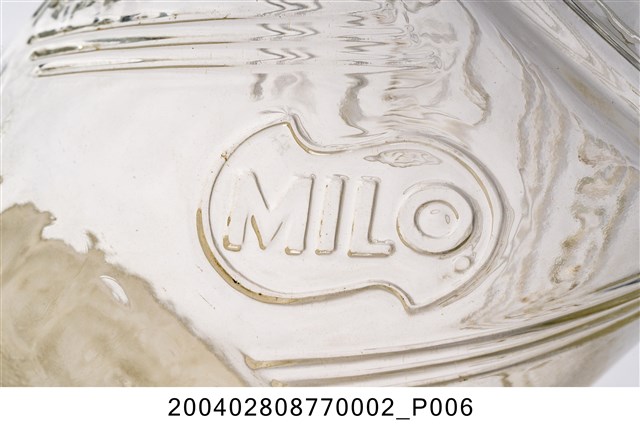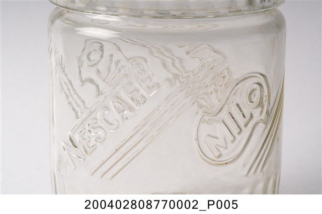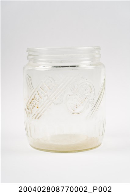 雀巢美祿透明玻璃罐罐身,由透明玻璃一體成形製成,玻璃厚實,圓形廣口,短直頸,上下各有一圈凸起橫紋,圓肩,圓柱狀瓶身,底部略內凹,裝飾細密點狀紋路,呈同心圓排列。器身壓印兩組雀巢咖啡「NESCAFÉ」和美祿巧克力麥芽飲品「MILO」商標,商標下方各有三道斜直紋。罐底留有咖啡色沈澱,罐身上商標紋路上卡有些許咖啡色汙垢。