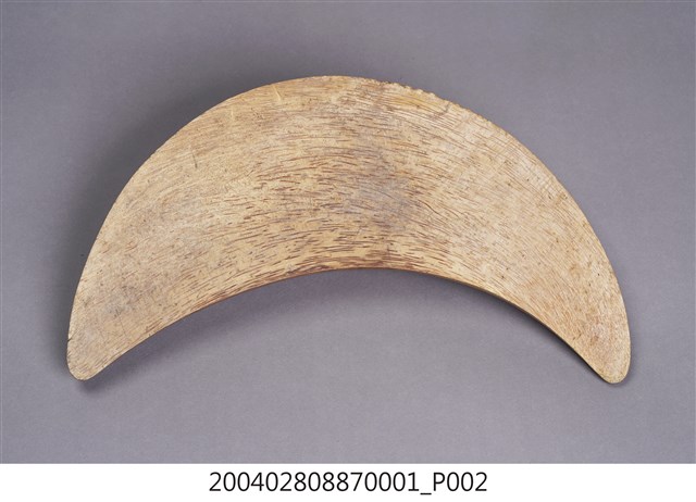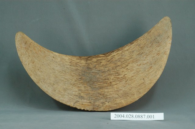 本組筊杯為竹製,一副兩片,以竹頭部位雕製,呈現新月外型,中央圓凸而兩端呈尖椎體,對半剖開之後而使每一片筊杯成為一面平坦而另一面浮凸之形式。浮凸一面的中央部位,雕磨之後所留下的竹頭節理花紋相當明顯,各有三處竹鞭生長基部所磨成的圓圈,大小不一,表面又施以透明漆而顯得光亮,對剖的平面沒有上漆,纖維紋路清晰。